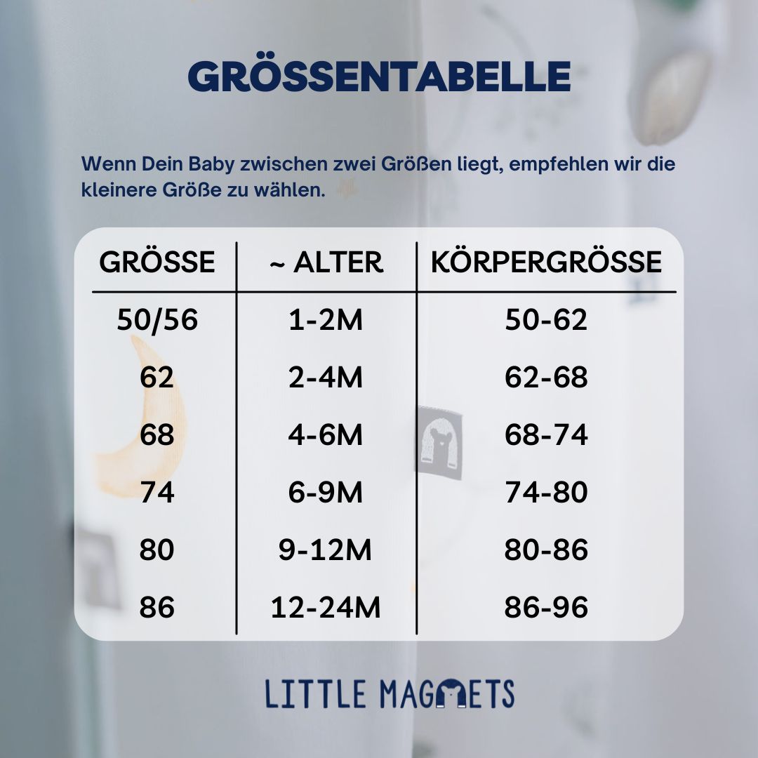 Wenn Dein Baby zwischen zwei Größen liegt, empfehlen wir die kleinere Größe zu wählen. Unsere Schlafanzüge mit Magnetverschluss sind größzügig geschnitten und wachsen mit Deinem Baby mit. Damit sind sie perfekt für eine längere Nutzung - nachhaltig und bequem für Dich und Dein Baby!